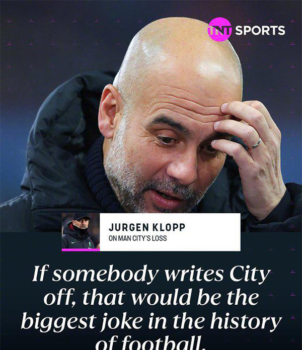 “如果这样,英超将出现前所未有的争冠景象---排名前六位的球队相差7分! 克洛普的观点大伙同意么? “如果有人就此以为曼城掉队了,那会是足球史上最大的笑话”