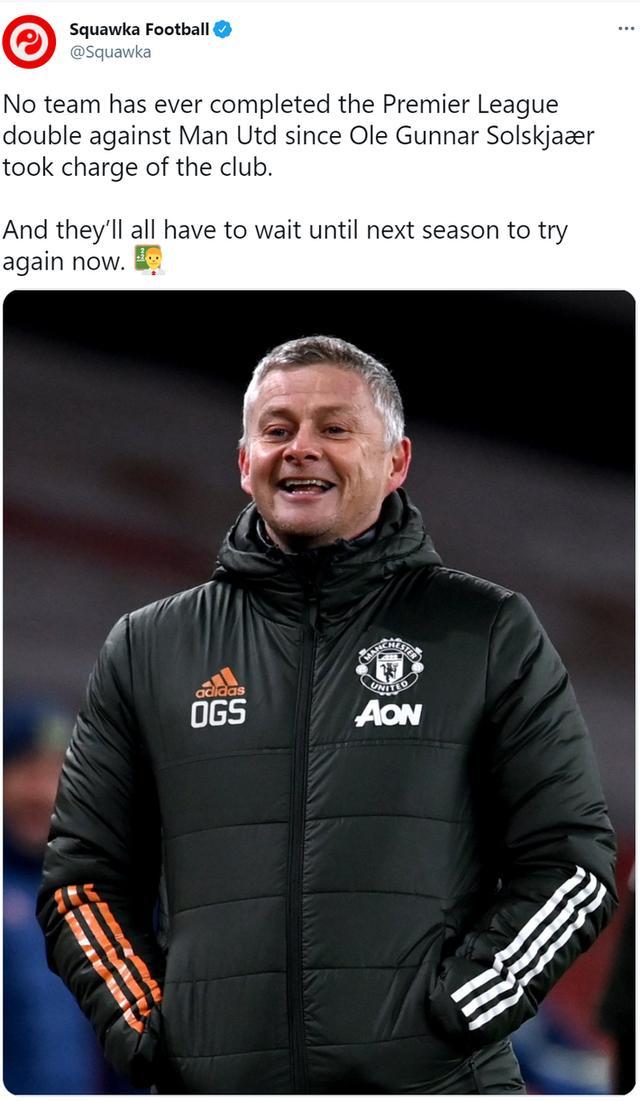 据统计,自从索尔斯克亚入主曼联之后,红魔还没有在英超联赛中被任何一支球队双杀过。