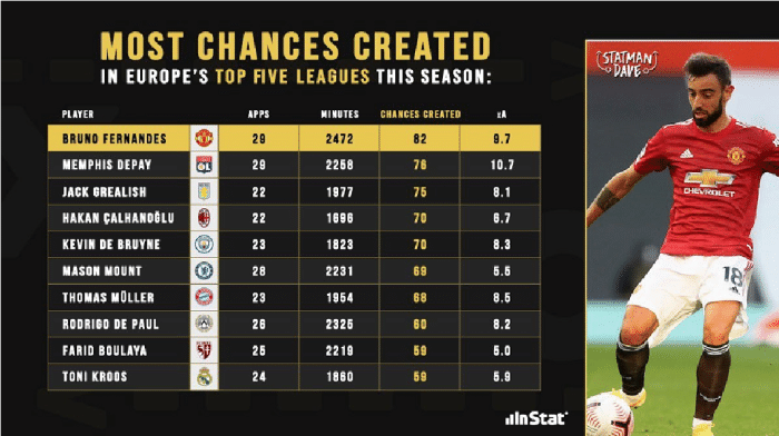 如图,B费是本赛季欧洲五大联赛赛场上制造绝佳机会最多的球员,他出场29次,累积2472分钟,制造了82次机会,平均每30分钟就能制造一次绝佳进球机会,不得不说B费的表现真的出色。而排名第二的是里昂的德佩,他制造了76次绝机会,不过B费出场时间更少,他平均29分钟就能制造1次绝佳机会,他的效率比起B费更高,不过相差并不明显。