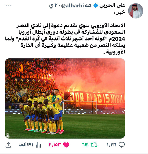 这一消息来自沙特的阿尔哈尔比(Al-Harbi),据其所称,欧足联认为在C罗加盟后,利雅得胜利已经成为全球最多人关注的三大俱乐部之一,在欧洲球迷之中也拥有很高的知名度。因此,虽然此前沙特足协被传向欧足联递交申请,希望让联赛冠军获得一个欧冠参赛外卡名额,但亚历山大·切费林更倾向于直接邀请利雅得胜利来踢。