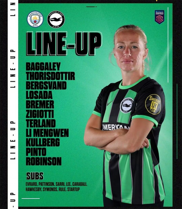 此役面对曼城,布莱顿踢433阵型,布雷默、特兰、凯蒂-罗宾逊组成三叉戟,洛萨达、齐焦蒂-奥尔默、塔蒂亚娜-平托搭档三中场,库尔贝里、托里斯多蒂尔、贝格斯万德、李梦雯组成四后卫,门将巴加列德。卡拉瓦利、李金玟、西蒙兹、鲁尔、萨里5人替补登场。