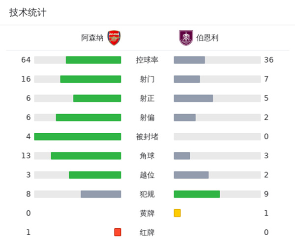 全场比赛结束,阿森纳3-1击败伯恩利。