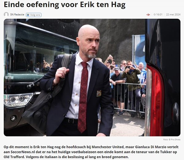 178直播讯 北京时间5月22日晚,知名转会专家迪马济奥接受荷兰媒体soccernews.nl的采访时表示,曼联已决定在赛季结束后与主帅滕哈格分道扬镳,新的主帅候选包括波切蒂诺、麦肯纳、德泽尔比等人。迪马济奥言之凿凿的表示:“可以肯定的是:曼联今夏将告别滕哈格。”