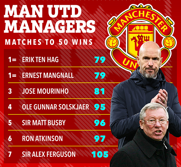 滕哈格带队79场完成50场胜利,超越了穆里尼奥的81场,与欧内斯特·曼诺尔并驾齐驱,后者是曼联队史第三任主帅,在1903年10月到1912年9月执教球队接近10年,并在1908年获得英甲冠军,那是曼联队史第一个重大冠军。他的第50胜也是1-0客场小胜,对手是布莱克浦。