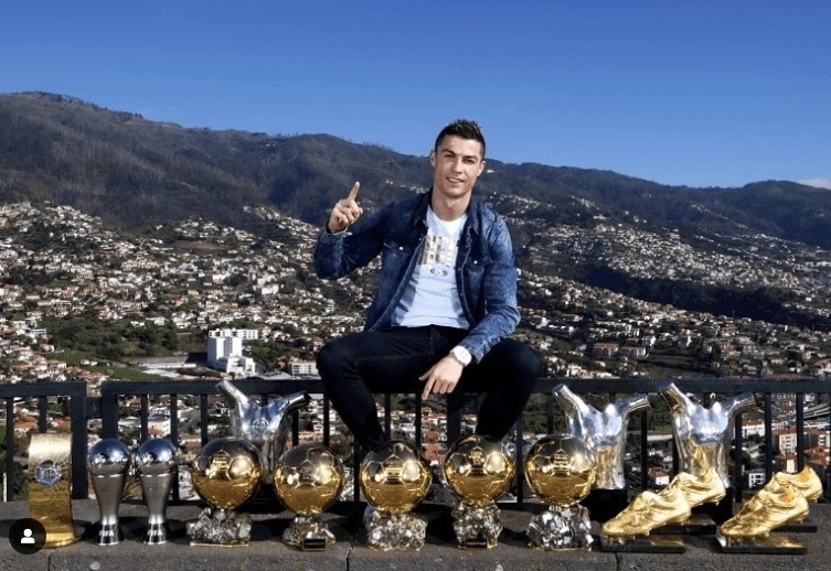 而2年后,当梅西再一次获得金球奖,而C罗则连30人候选都没进时,这位C罗铁粉再次不满,他晒出了葡萄牙巨星帅照,照片中C罗霸气比出“第1”的手势,而他的身前则是他生涯所有拿到的重要荣誉,包括5座金球奖、4个欧洲金靴等。