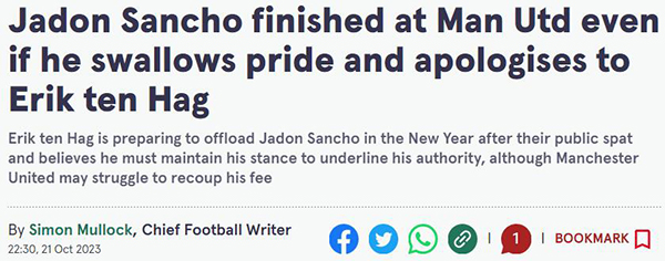 178直播10月22日讯 英国《每日镜报》报道称,23岁的杰登·桑乔在曼联的生涯已经结束(Jadon Sancho finished at Man Utd),即使这位7300万英镑边锋放下自己的骄傲,向主帅滕哈格道歉,也将不会得到接受。桑乔唯一能挽救其红魔命运的剧情,就是期待53岁的荷兰籍主帅下课。