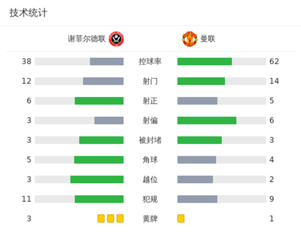 全场比赛结束,最终曼联2-1战胜谢菲尔德联队升至联赛第8。