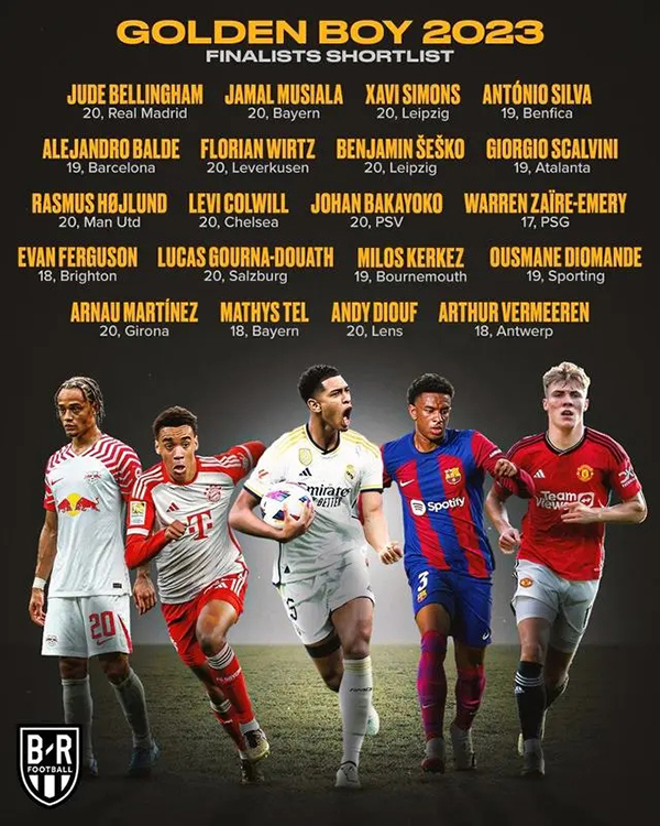 178直播10月13日金童奖25人名单公布,贝林厄姆、穆西亚拉、霍伊伦、特尔、埃文-弗格森、亚马尔入选。