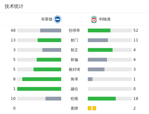 178直播讯 :北京时间10月08日英超联赛第8轮,布莱顿主场对阵利物浦。上半场阿丁格拉抓住利物浦后防传球的失误率先破门,萨拉赫梅开二度反超比分;下半场替补登场的赫拉芬贝赫射门击中横梁弹出,随后邓克抢点破门为布莱顿扳平比分,最终双方2-2握手言和。