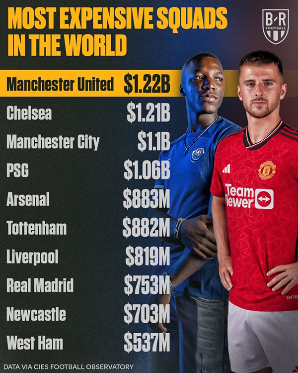 颇为讽刺的是,曼联和切尔西组建当前阵容的花费分别为12.2亿欧和12.1亿欧,占据世界足坛前两位。但是两队的成绩却并没有与支出相匹配,堪称是公认的“冤大头”。