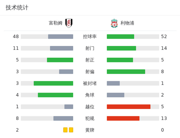 全场比赛结束,最终利物浦1-1富勒姆,总比分3-2。