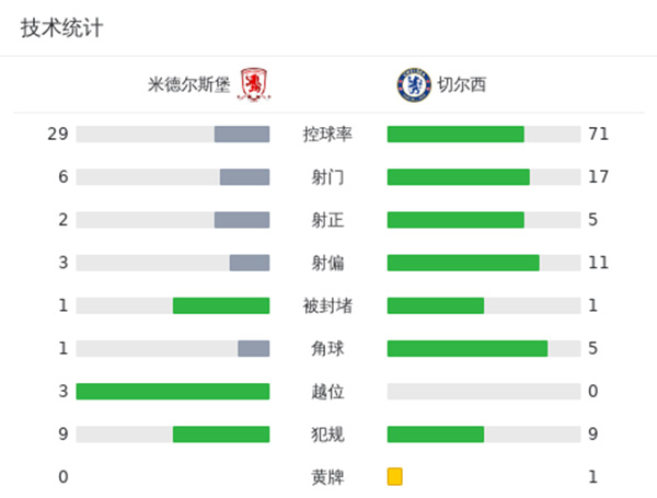 关键事件: 第36分钟,巴利瑟后场长传,琼斯右路穿裆科尔维尔横敲,赫根尼包抄推射得手,米德尔斯堡1-0切尔西!
