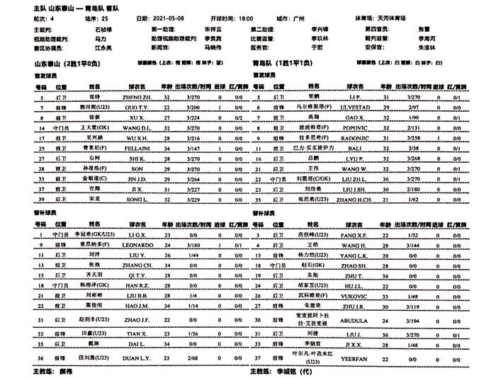 178直播讯 北京时间5月8日,中超联赛第4轮展开争夺,首场比赛是齐鲁德比,泰山队对阵青岛队。赛前,双方首发名单公布。