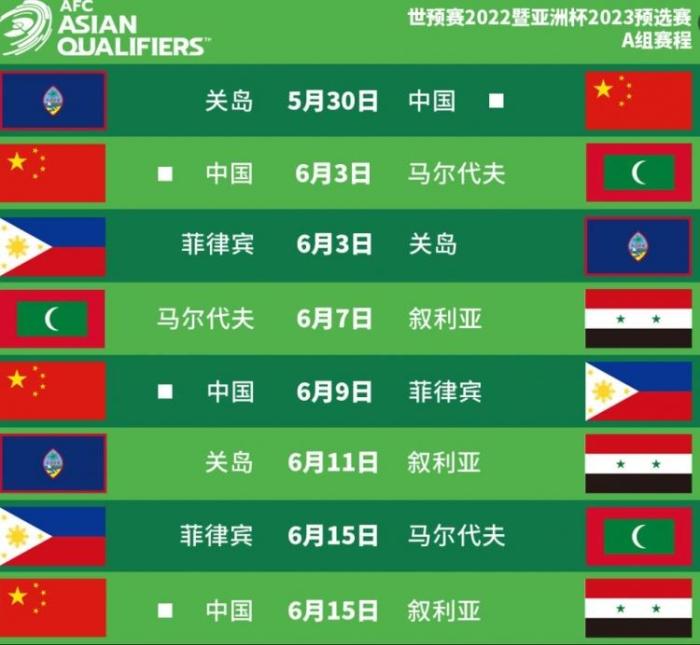 178直播讯 北京时间4月1日,根据亚足联官方消息,预选赛第二阶段剩余比赛日期已经确定,中国队所在A组的比赛将在苏州举行。国足将于5月30日率先迎战关岛,6月15日对阵叙利亚。