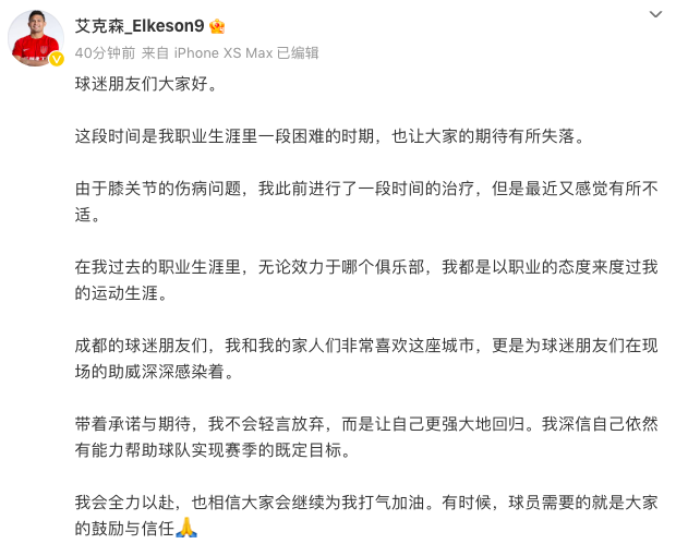 艾克森还否认了自己在成都队“摆烂”的传闻,他表示在自己的职业生涯中,无论效力哪家俱乐部,都是以职业的态度来度过他的运动生涯。最后,艾克森感谢了成都球迷,直言自己和家人很喜欢这座城市,他也会带着承诺与期待,不会轻言放弃,会继续努力康复,争取在未来以更强大的姿态回归。