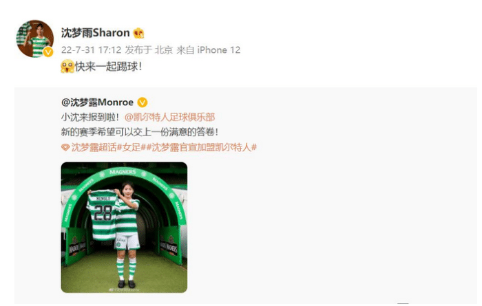 官宣加盟凯尔特人之后,沈梦露更新社交动态,表示:“小沈来报到啦!新的赛季希望可以交上一份满意的答卷!”沈梦雨转发了沈梦露的动态,并且附上一句话:“快来一起踢球!”沈梦露已经拿到了凯尔特人女足的28号球衣。这个号码有特殊意义,沈梦露的偶像是C罗,而C罗出道时的豪门就是28号,沈梦露留洋之后一直选穿28号致敬偶像,未来可期。