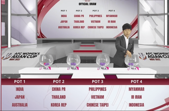 178直播10月28日讯 ,2022女足亚洲杯分组抽签仪式举行,此前进行的女足亚洲杯的比赛已经决出了12强,12支晋级的球队分别是印度队,澳大利亚队,中国队,中国台北,印度尼西亚,伊朗队,日本队,韩国队,缅甸队,菲律宾队,泰国队,越南队,本次女足亚洲杯女足的比赛将会在印度举行。