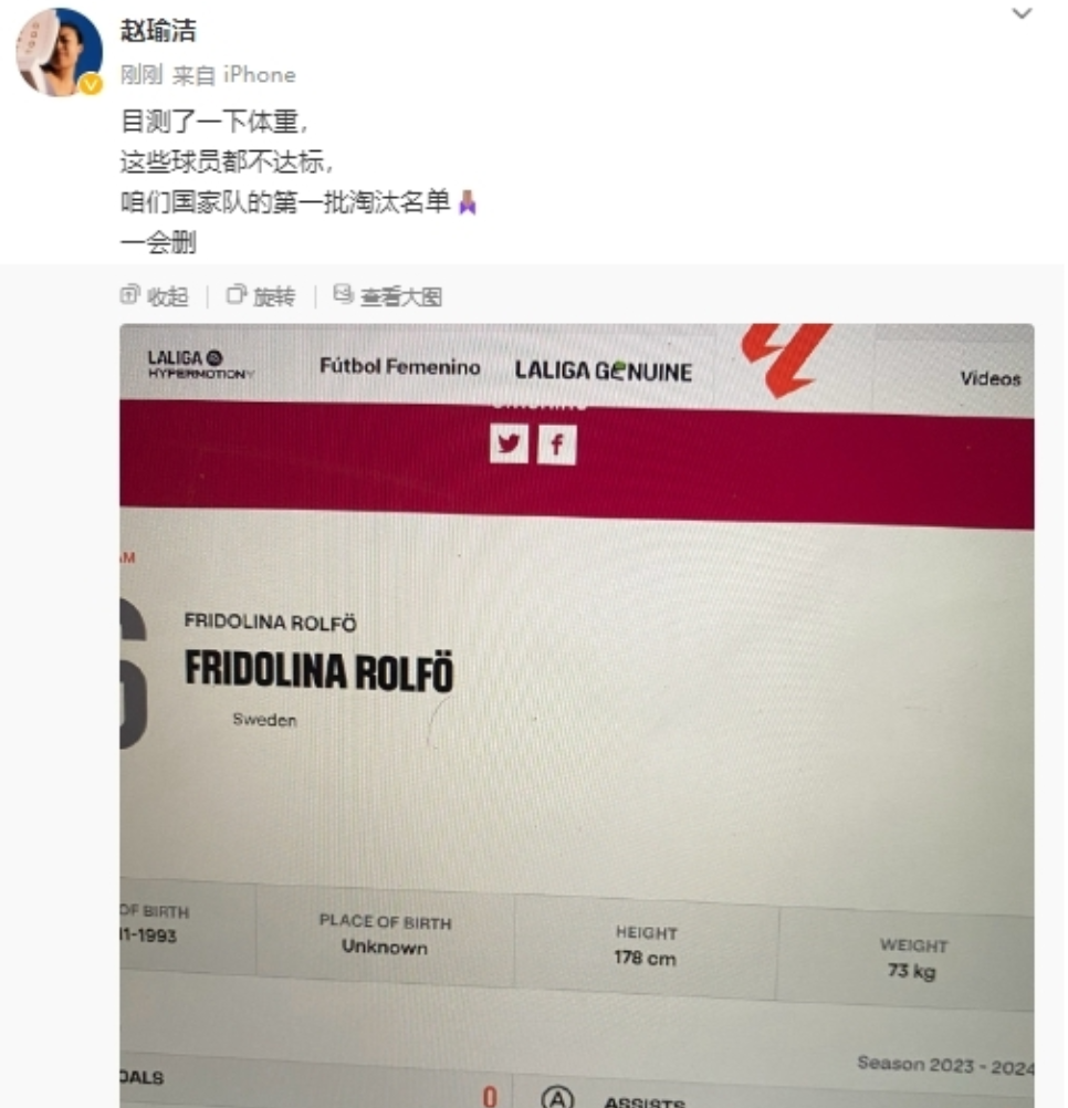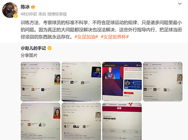 女足在世界杯表现没有达到预期,多名球员发声,除了唯一没有上场的球员肖裕仪表示我本将心向明月之外,还有另一名留洋球员赵瑜洁在社交媒体上发声,直指中国女足的选人标准,晒出克尔、劳伦-詹姆斯、普特拉斯等女足球员的体重数据,称在中国女足这样的球员连第一轮都无法通过。