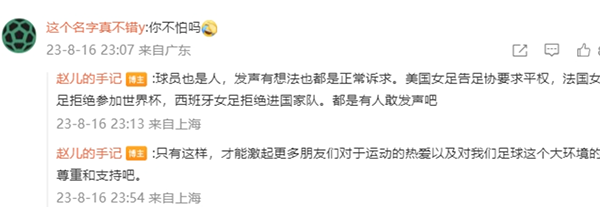 同时赵瑜洁还表示自己在社交媒体上发声不会感到害怕,她直言发声是正常的诉求,美国女足告足协要求平权,法国女足拒绝参加世界杯,西班牙女足拒绝进国家队,都是面对不公平的对待之后敢于发声的例子。