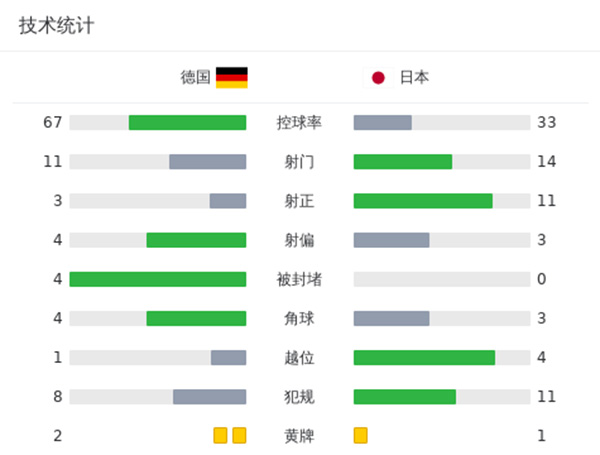 双方出场阵容: 德国出场阵容:1-特尔施特根、6-基米希、15-聚勒、2-吕迪格、5-施洛特贝克(63’20-戈森斯)、23-埃姆雷-詹(63’24-格罗斯)、21-京多安、9-维尔茨(72’17-布兰特)、10-格纳布里(80’11-沙德)、19-萨内、7-哈弗茨(72’13-穆勒) 替补未出场:12-特拉普、22-鲍曼、3-佳夫、4-若纳坦-塔、8-恩梅查、13-穆勒、16-亨里希斯、18-霍夫曼 日本出场阵容:12-大迫敬介、16-富安健洋、4-板仓滉、2-菅原由势(83’19-桥冈大树)、21-伊藤洋辉、5-守田英正(73’17-田中碧)、6-远藤航、8-镰田大地(58’3-谷口彰悟)、14-伊东纯也(73’20-久保健英)、7-三笘薰(83’10-堂安律)、9-上田绮世(58’18-浅野拓磨) 替补未出场:1-中村航辅、23-施密特、11-古桥亨梧、13-中村敬斗、15-伊藤敦树、22-町田浩树、24-森下龙矢、25-前田大然、26-每熊晟矢