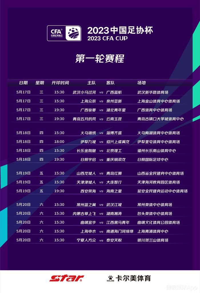 2023中国足协杯第一轮比赛将于5月17日至20日分别在16个城市举行,本轮由16支业余球队主场对阵16支中乙球队,赛程及开球时间如下: