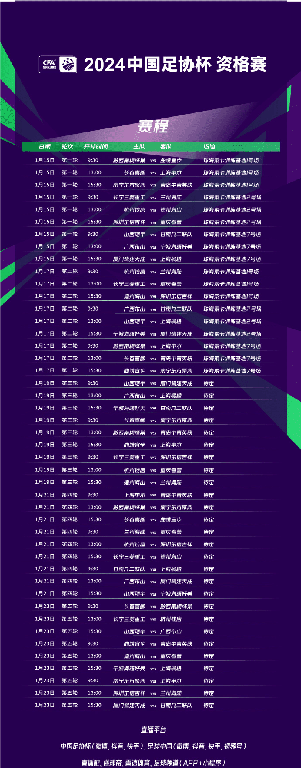 178直播01月15日讯 ,中国足协杯官方消息,1月15日,2024中国足协杯资格赛将在珠海索卡训练基地开赛,18支业余球队抽签分成三组,将展开五轮角逐,向足协杯正赛发起冲击。