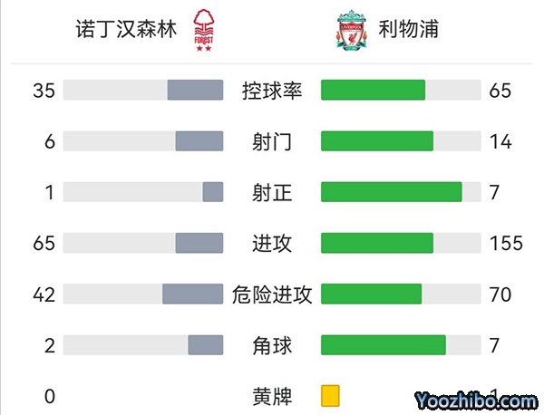 全场比赛结束,利物浦客场1-0诺丁汉森林。