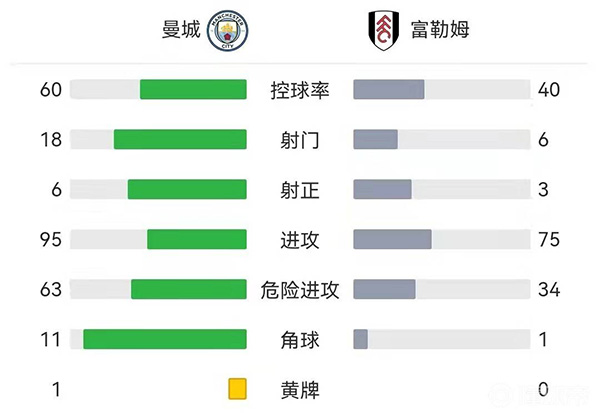 全场比赛结束,曼城4-1大胜富勒姆,晋级下一轮。