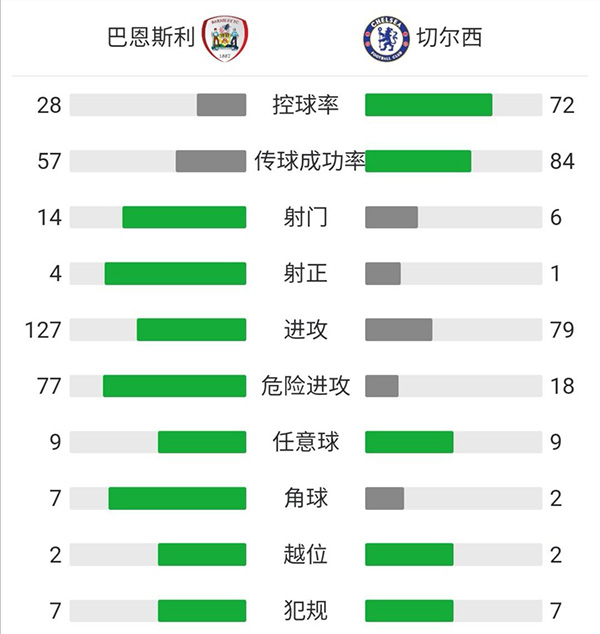 查看:巴恩斯利vs切尔西 全场录像技术统计:
