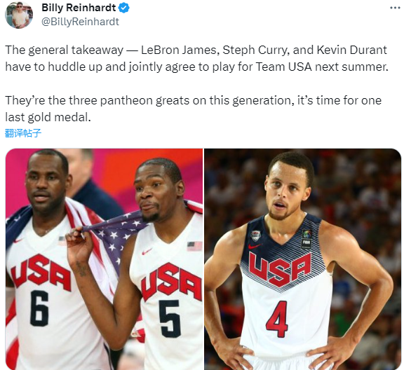 NBA记者BIlly Reinhardt表示詹姆斯、库里和杜兰特必须一起联手,共同为美国男篮出战巴黎奥运会,他们是这一代的超级巨星,是时候联手争夺一枚奥运金牌了。