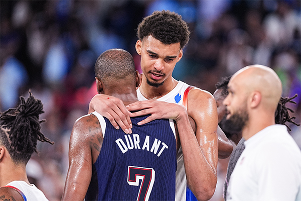 178直播讯 2024年巴黎奥运会已经结束,法国男篮在决赛中不敌美国男篮从而夺得银牌,美国队夺得金牌;赛后文班亚马泪洒赛场并且紧紧拥抱杜兰特。