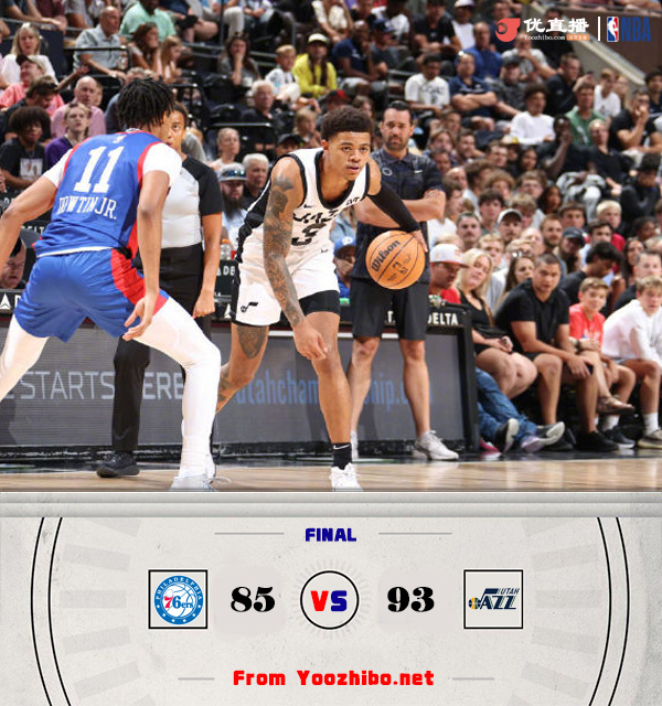 178直播7月11日讯 NBA盐湖城夏季联赛,76人对阵爵士。一开场,双方势均力敌,比分始终紧咬,爵士内外开花,76人连投带罚打出8-0迅速回应,次节阿鲁玛三分吹响球队进攻的号角,76人持续发力扩大领先,爵士不断冲击篮筐努力追赶,康西尔飙中三分,半场战罢76人44-34领先10分。下半场,爵士大举反击,多点开花不断迫近比分,森萨博反击暴扣带队反超,末节双方争夺陷入白热化,比分交替领先,关键时刻爵士连投带罚确立优势,76人苦苦追赶无果。最终,爵士93-85力克76人。