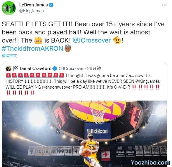 178直播08月20日讯这个休赛期,NBA巨星詹姆斯完成了续约,他将会率领湖人在新赛季冲击总冠军。因为上个赛季的失败,詹姆斯连附加赛的名额都没有捞到,他很早就进入到度假的模式,所以长时间不摸球之后詹姆斯连续参加比赛,包括德鲁联赛等,如今詹姆斯要出战在西雅图进行的The CrawsOver半职业联赛,这是克劳福德举办的赛事,詹姆斯已经在社交媒体上表示要参赛。