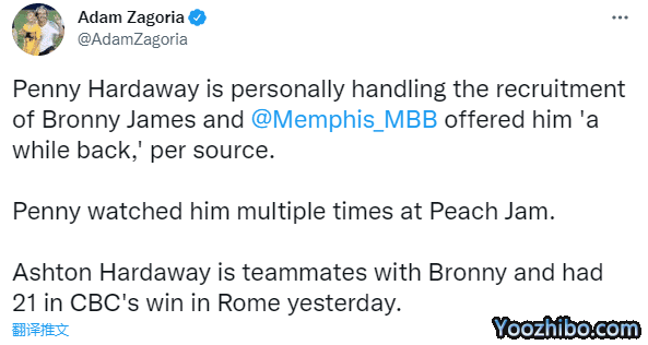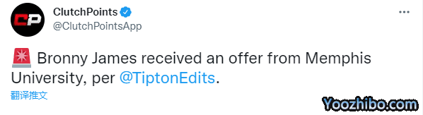 178直播08月20日讯,据美记者JoeTipson报道,詹姆斯的大儿子布朗尼已经收到孟菲斯大学的offer邀请函,该大学是德里克-罗斯、NBA名宿哈达威以及今年13号秀杰伦-杜伦等人的母校;其中“便士”哈达威是孟菲斯大学的现任主教练,他正在积极招募布朗尼。
