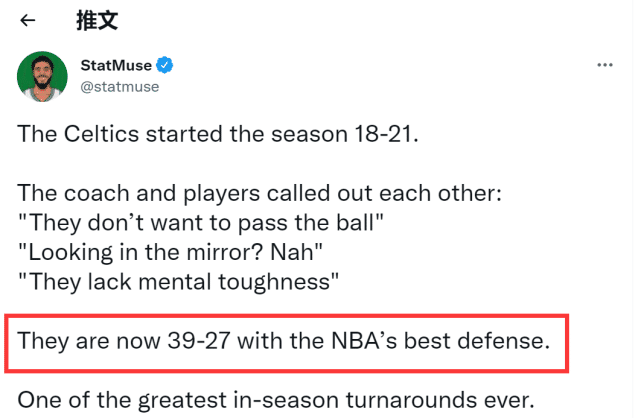 如今,绿军战绩已经来到39胜27负排在东部第5,距离第4的公牛只差1个胜场,而且绿衫军的防守已经排在全联盟第一,美媒statmuse表示绿衫军打出了有史以来最伟大的季中华丽转身之一。