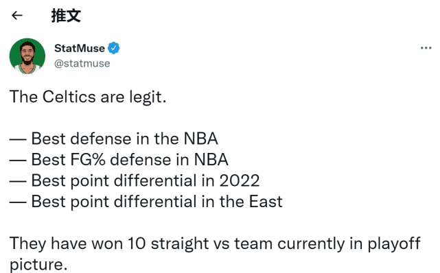 除此之外,凯尔特人限制对手命中率联盟第一,进入2022年后,凯尔特人的净胜分差排在联盟第一,即便是整个赛季,他们的净胜分差也是东部第一。而且绿衫军已经连续击败10支目前排在季后赛行列的强队,含金量十足!