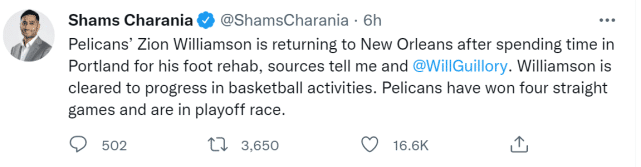 178直播讯3月6日讯 ,据名记Shams报道,鹈鹕新星锡安在波特兰结束了足部康复训练之后,即将回到新奥尔良和球队会合。消息人士告知,锡安已经获准参加篮球活动。赛季至今,锡安还没上过场,何时复出仍是未知数。不过,他至少离复出又近了一步。鹈鹕近况甚佳,已经取得4连胜,有望竞争附加赛名额。