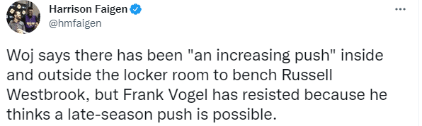 消息人士透露,教练组和威少对于自己的使用有着不同的看法,这在一定程度上也解释了过去几天沃格尔和威少之之间的一些紧张时刻,包括周六的录像分析课