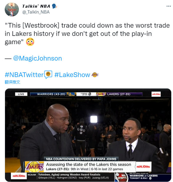 湖人主场再战勇士,湖人名宿魔术师约翰逊来到现场,赛前魔术师谈到威少本赛季的表现,他表示他已经受够了威少的各种借口,直言如果湖人没有从附加赛中突围,那么威少的交易就真的是湖人队史最糟糕的交易。