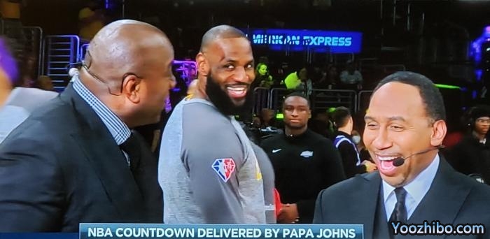 魔术师接受采访时,詹姆斯路过和魔术师打招呼,咧嘴大笑十分抢镜。