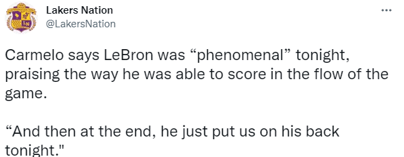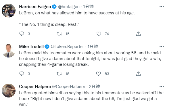 赛后库里表示:很显然,詹姆斯今晚打得非常棒,你不得不承认他命中了一些艰难的出手,但我们自身仍然存在着一些问题;安东尼表示詹姆斯今晚扛着球队赢球,里夫斯言简意赅:勒布朗就是勒布朗,那就是我能所说的;威少则表示:当詹姆斯打出这种表现时,其他球队真的无能为力!