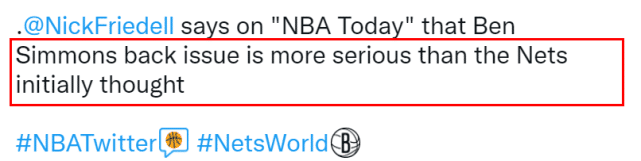 Friedell表示,西蒙斯还不能和全队进行合练,他预计需要几周时间才有可能上场,此前也有报道称,西蒙斯肯定不会参加3月11日篮网客场对76人的比赛。