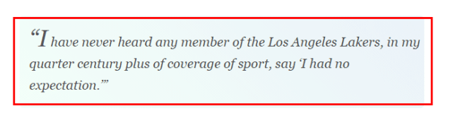 随后,这位名嘴解释了自己如此评论威少的原因。“在我25年的体育报道生涯里,我从未听过任何洛杉矶湖人队的球员说过‘我没有任何期望’,首先,身穿紫金球衣就会带来期望,他们拿过17个总冠军,好吧。第二,也是最重要的一点,你的队友是勒布朗-詹姆斯和安东尼-戴维斯,他们都有冠军,而你被詹姆斯带到这里,也是为了拿冠军的。我知道你在回答问题,但底线是你要传播的答案是面向大众的……包括湖人国度。”
