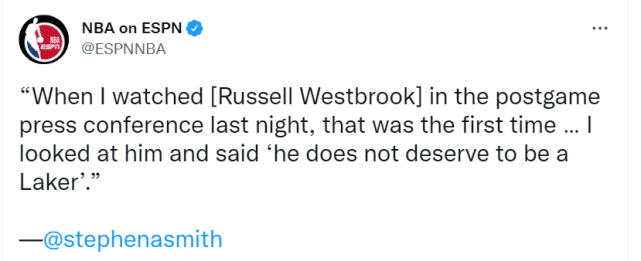 这番话,在斯蒂芬-A-史密斯看来,是一种毫无斗志的表现。“过去这一年,很多时候人们不公正地攻击他的性格,我认为他是一个努力而且无私的人,他不是一个不在乎的人,他从来不会去尝试欺骗我们,”斯蒂芬-A-史密斯说道,“但当我昨晚看过威少的新闻发布会后,那是我第一次看着他说‘他不配成为一名湖人球员’。”