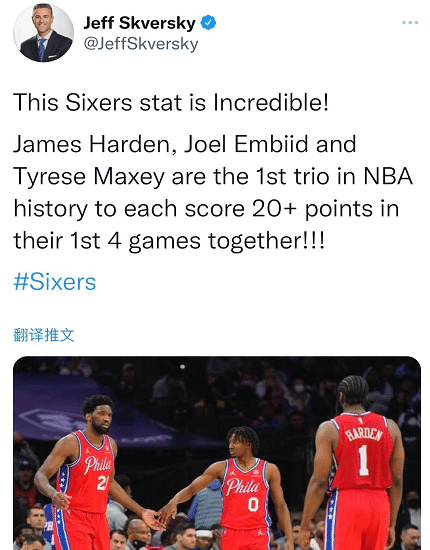 同时哈登还和另外“两大巨头”创纪录:恩比德、哈登、马克西配合出战的前4场比赛中,三人每场比赛的得分均为20+。这是NBA历史首次有三人组达成该数据。