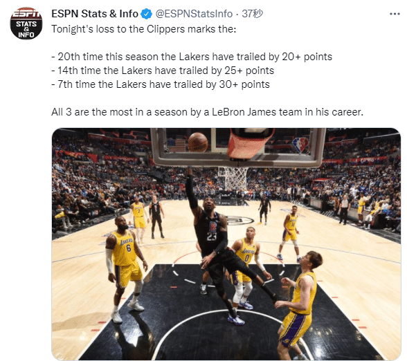 湖人耻辱惨败一战,赛后詹姆斯离场一幕曝光,早早离开替补席,脸上写满了沮丧和郁闷,大步走回更衣室;37岁詹姆斯在生涯第19个赛季带队创耻辱纪录——据统计,湖人本赛季已经20次至少落后20分,14次至少落后25分和7次至少落后30分,这三个都是詹姆斯职业生涯单赛季最多的。