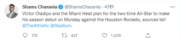 热火好消息,据名记shams报道,奥拉迪波计划在下周二在热火对阵火箭的比赛中完成赛季首秀,29岁奥迪复出倒计时,复出首战对阵老东家,时隔将近1年终于痊愈。