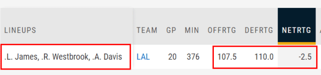 威少、詹姆斯和浓眉赛季至今一共有20场比赛同场,累计同场时间376分钟,进攻效率107.5,防守效率110.0,百回合输给对手2.5分