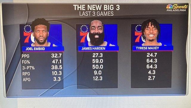 美媒晒出了3人在过去3场的场均具体数据,确实相当厉害。恩比德场均32.7分10.3篮板3.3助攻,投篮命中率47.1%,三分命中率38.5%;哈登场均27.3分9篮板12.3助攻,投篮命中率59%,三分命中率50%;马克西场均24.7分4.3篮板2.7助攻,投篮命中率64.3%,三分命中率64.3%。