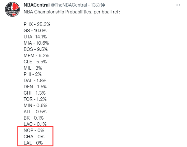 今日美媒NBACentral晒出了数据网站bball ref计算的本赛季各队夺冠概率,太阳以25.3%排名第一,勇士第二,篮网、76人和湖人的夺冠几率均被看衰,其中湖人夺冠概率0%。